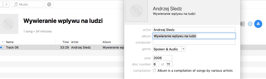So what is the digital preservation/digital curation conundrum? The title in the metadata of the track is nothing to do with the breath track! The CD is clearly labelled on the outside but when I open up the file, the metadata reports that the author is Andrzej Sledz on an album titled ‘Wywieranie wplywu na ludzi’ English translation ‘Influencing people’, year 2006. I recollect Malcolm telling us nothing about Andrzej nor anything about this file title. The internet does tell me Andrzej is a filmmaker but there’s no obvious connection …